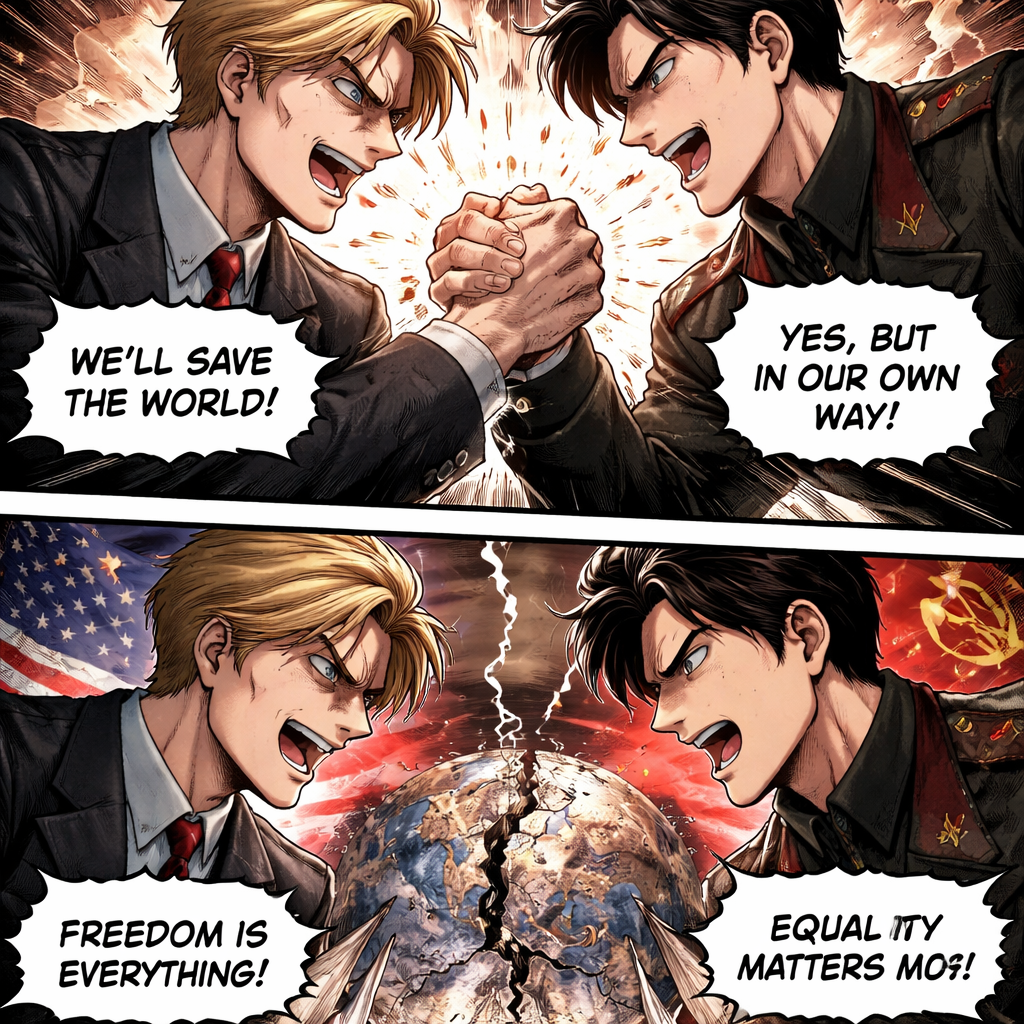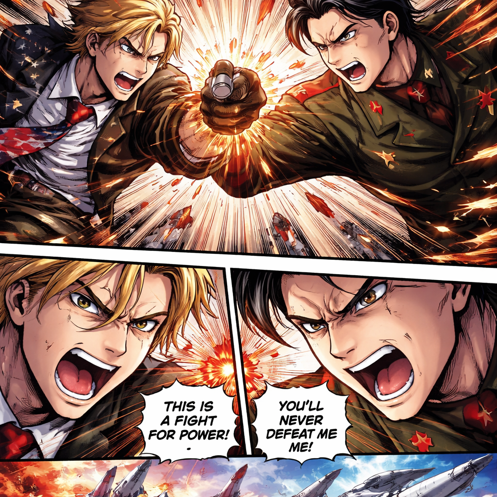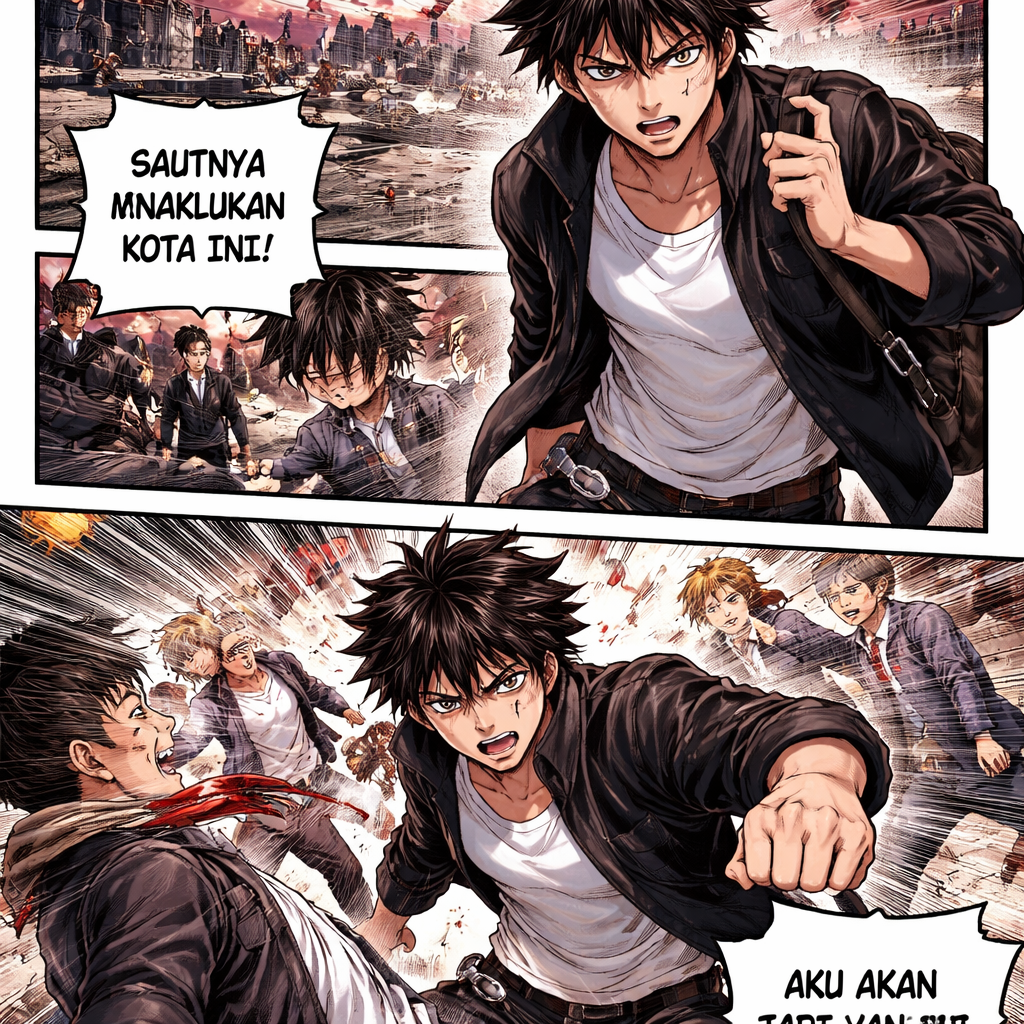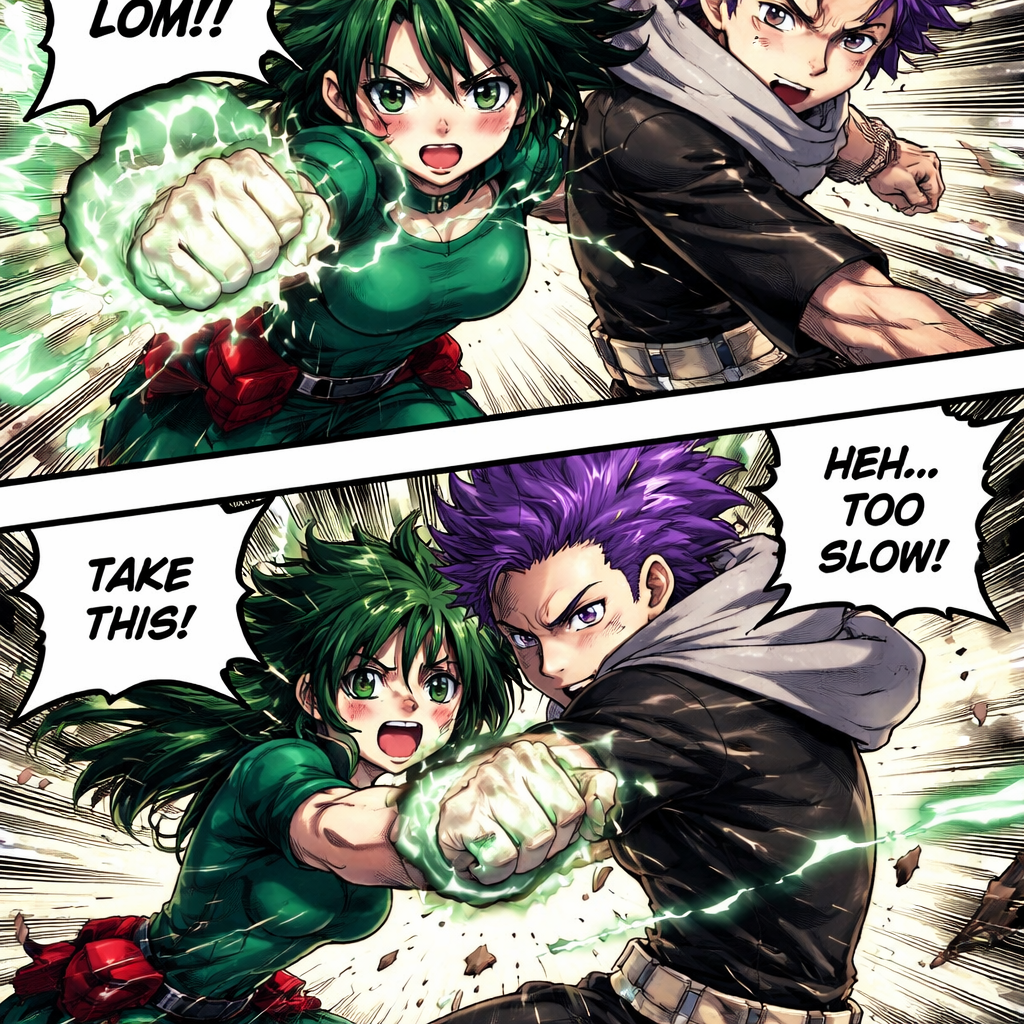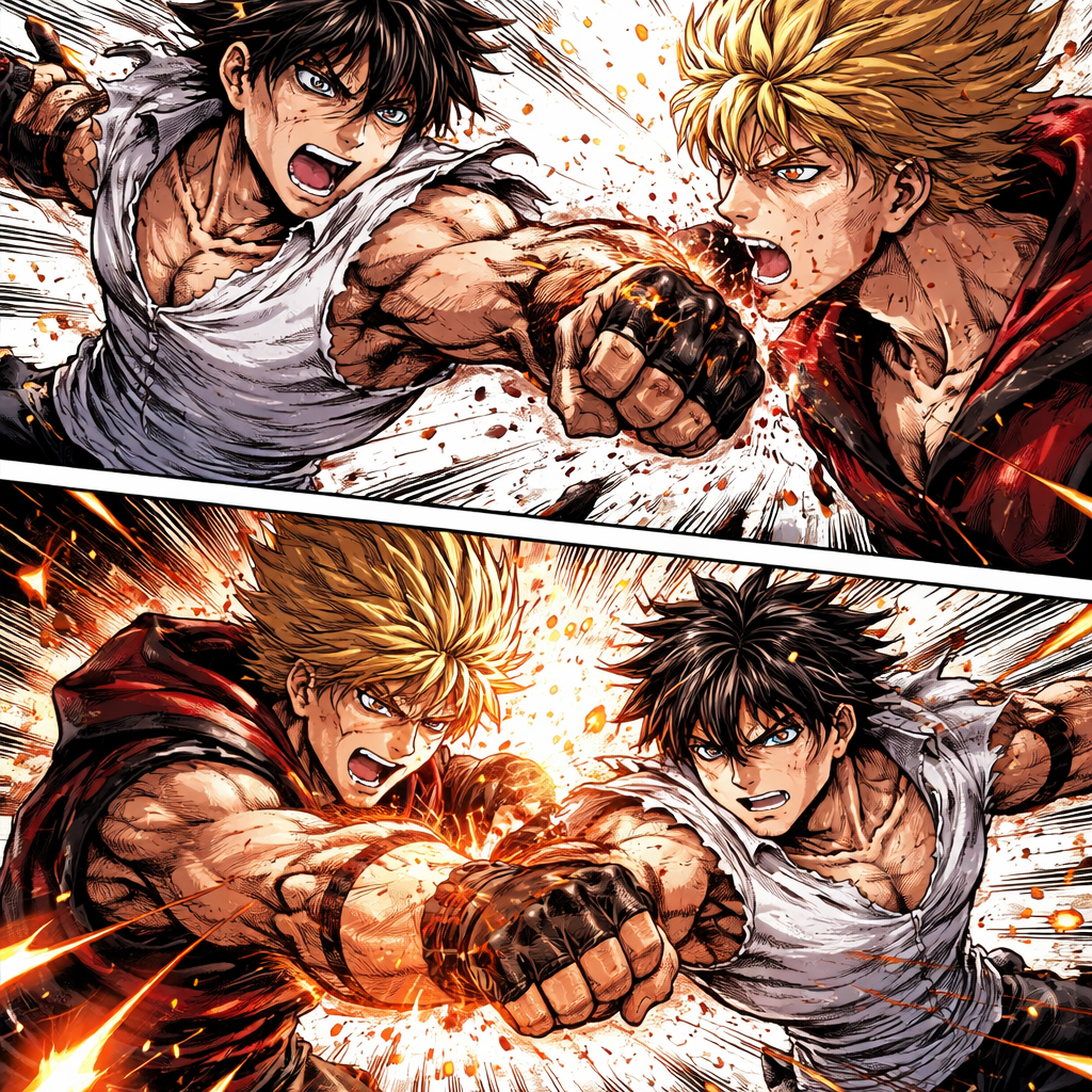 Ken blinked out of view, reappeared behind Aki, and swung a crowbar through a slowed-time loop. Aki dodged effortlessly and countered with a surge of kinetic energy that sent Ken tumbling.