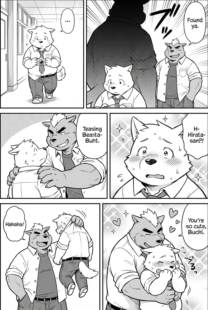 ![6-panel manga page, comic strip, story flow, coherent narrative, [Panel 1: (Buchi) small chubby anthro canine walking alone, holding camera, looking timid], [Panel 2: A massive shadow looms over him, (Hirata) huge muscular anthro bear appearing behind Buchi, extreme height difference], [Panel 3: Hirata leans down, placing a large heavy hand on Buchi's small shoulder, teasing grin], [Panel 4: Close up of Buchi looking up, tiny compared to Hirata, eyes wide, heavy blushing, flustered], [Panel 5: Hirata lifting Buchi up slightly by his shirt collar, affectionate bullying, Hirata laughing], [Panel 6: Hirata hugging the small Buchi tightly from behind, Buchi's face buried in his arms, embarrassed], {{{Buchi character}}}, small stature, chubby canine, white fur, floppy ears, {{{Hirata character}}}, giant build, muscular bear, brown fur, monochrome, manga style, screentone, sharp lineart, school uniform, detailed background, high quality](https://media.mangaai.com/629b4d27-a14a-4e76-8262-979d08006768.jpg)