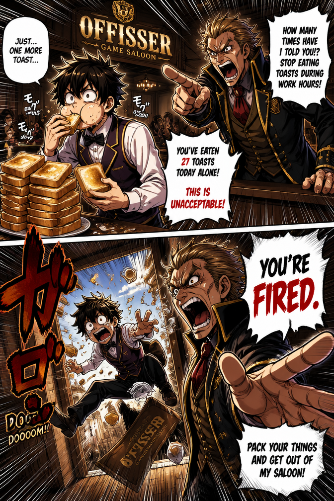 a young man gets fired from a game saloon called offisser by his boss because he ate too much toasts