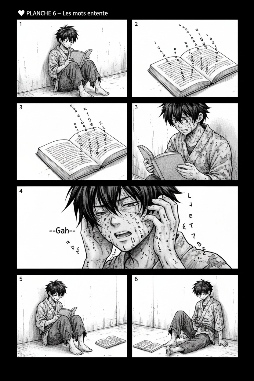 - "At least one silent panel sequence per chapter to externalize cognition (faces, hands, maps, ledgers, roads)"