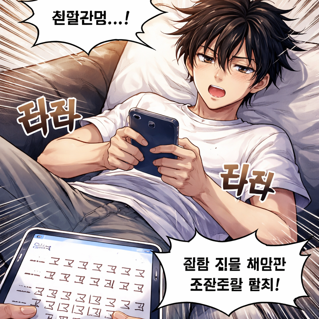 ![주인공이 소파에 누워 성의 없이 스마트폰 자판을 툭툭 치는 모습. 화면에는 "ㄱㄱㄱㄱㄱ"가 가득함. "아, 귀찮은데... 일단 대충 채워서 포인트만 받자!" (효과음: 타닥타닥) [단순 반복 금지] 의미 없는 자음/모음, 특수문자 나열은 반려 대상입니다.](https://media.mangaai.com/ec258986-0f52-495d-a492-b8632127830a.png)