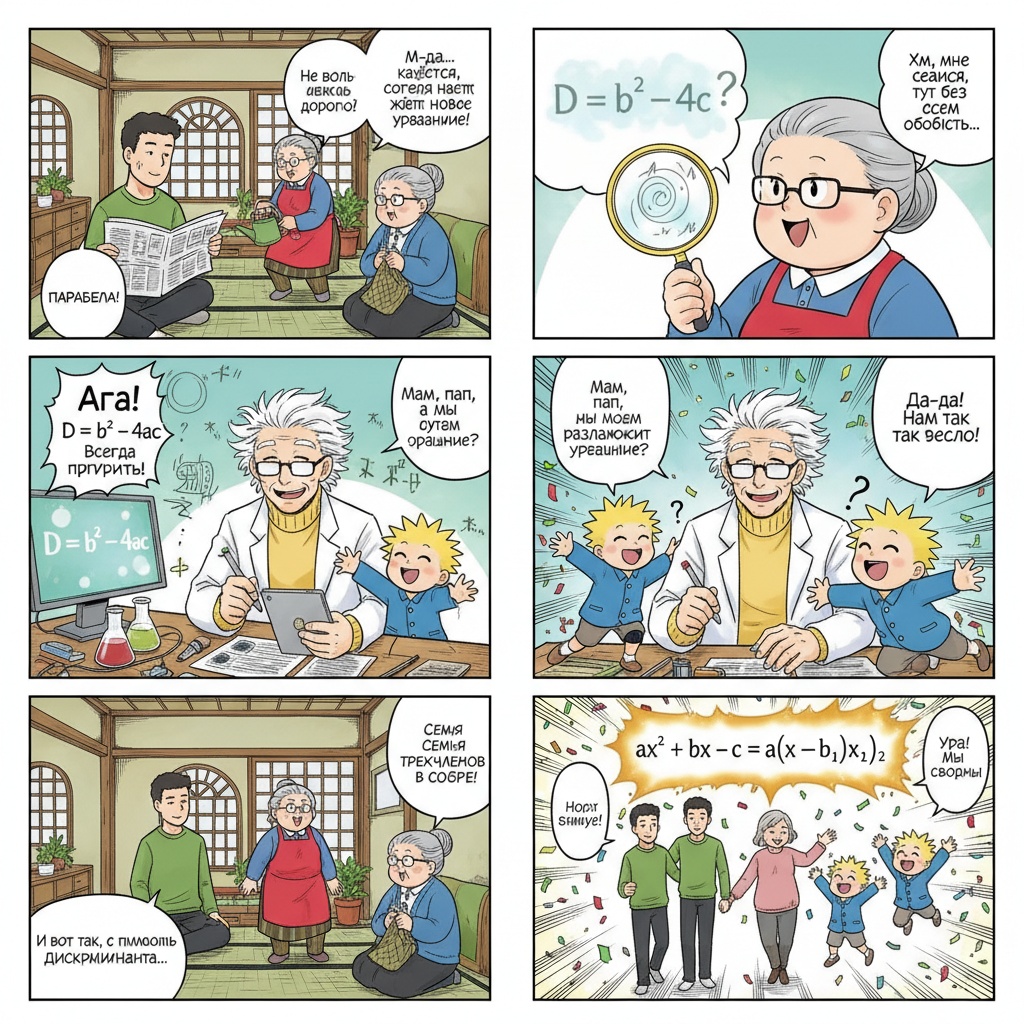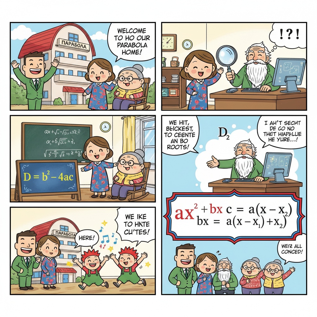 Комикс в стиле семейной комедии. Три члена — ax², bx, c — представлены как “семья трехчленов”, живущая в многоэтажке под названием “Парабола”. Изобрази сцены: a — папа, b – мама, с – бабушка, дедушка Дискриминант: Мудрый старец или гениальный учёный. Имеет прибор (лупу или компьютер) для расчёта формулы дискриминанта (D = b^2 - 4ac). Дети - Корни x_1 и x_2: два весёлых близнеца. Добавь смешные диалоги. Семья раскладывается в формулу ax^2 + bx + c = a(x - x_1)(x - x_2) Цветовая гамма – зеленая, красно-синяя, желтая
