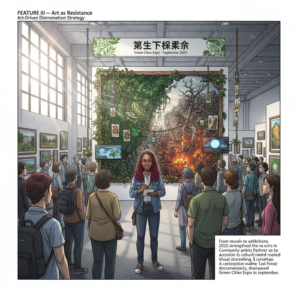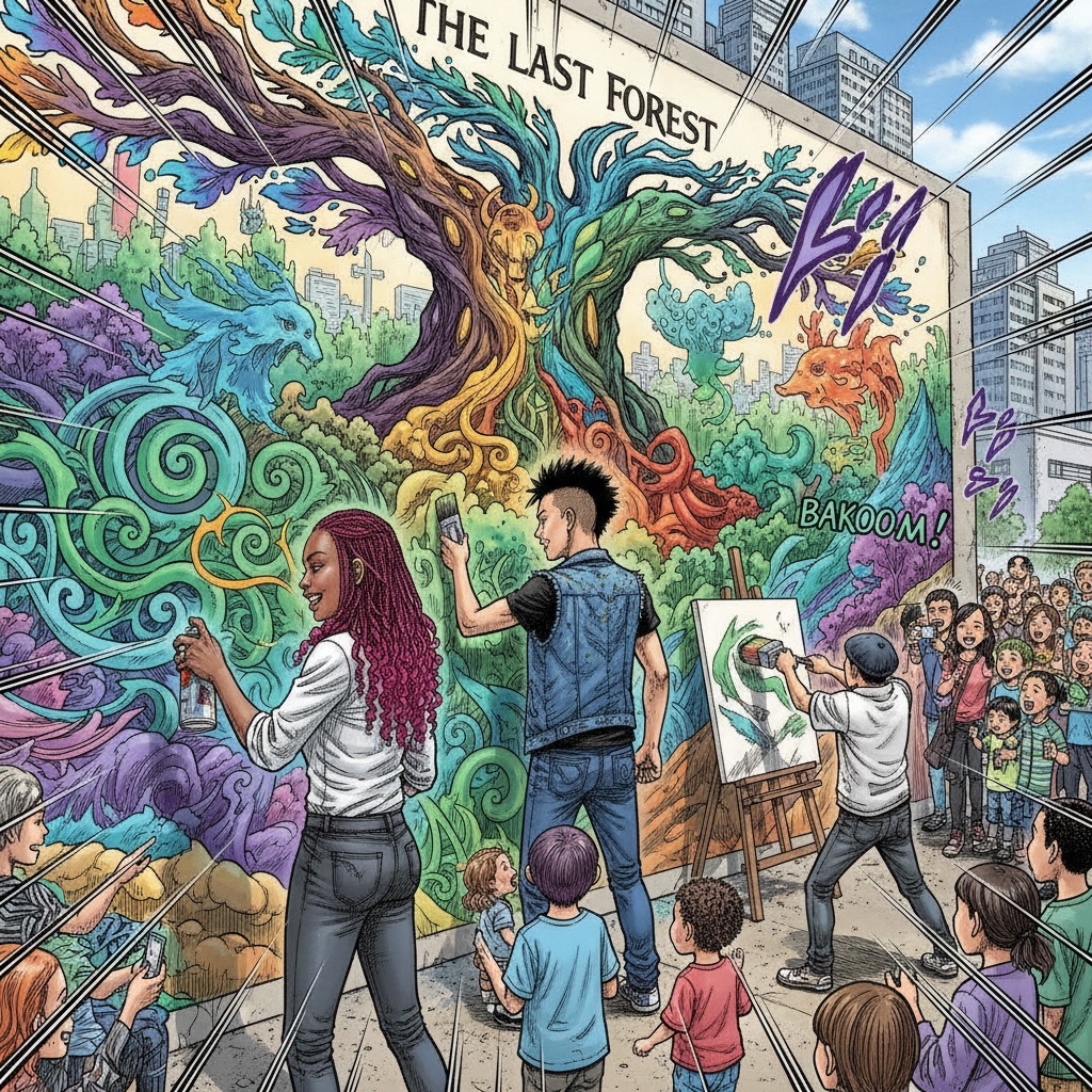 High-energy manga scenes of murals, live painting, The Last Forest–inspired exhibitions.