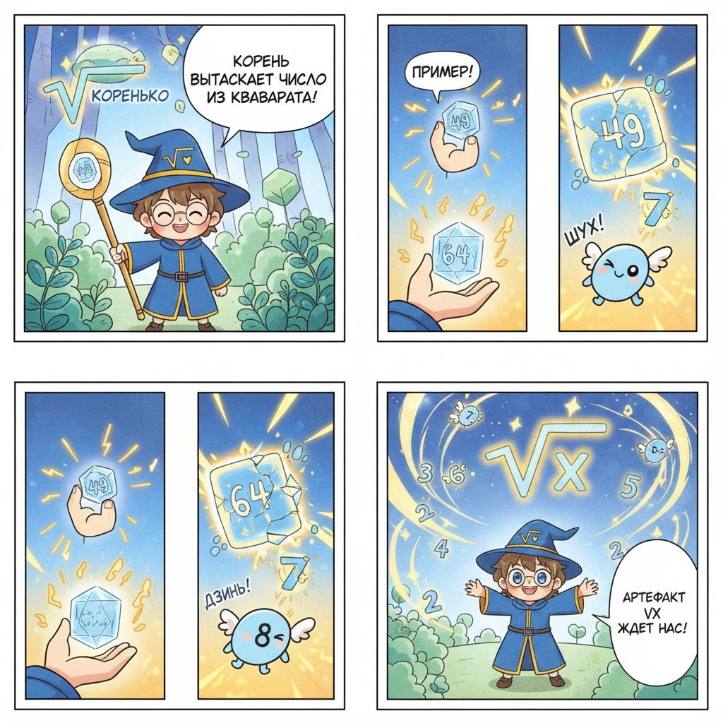 Создай комикс в стиле приключенческого фэнтези. Главный герой — юный математический маг по имени Коренько, который ищет волшебный артефакт √x, способный уменьшать большие числа. Изобрази сцену, где Коренько объясняет: “Корень вытаскивает число из квадрата!”, показывает примеры √49, √64 как магические кристаллы. Добавь визуальную метафору: квадрат превращается в светящийся камень, а из него выходит число. Цвета — яркие, голубые и золотые