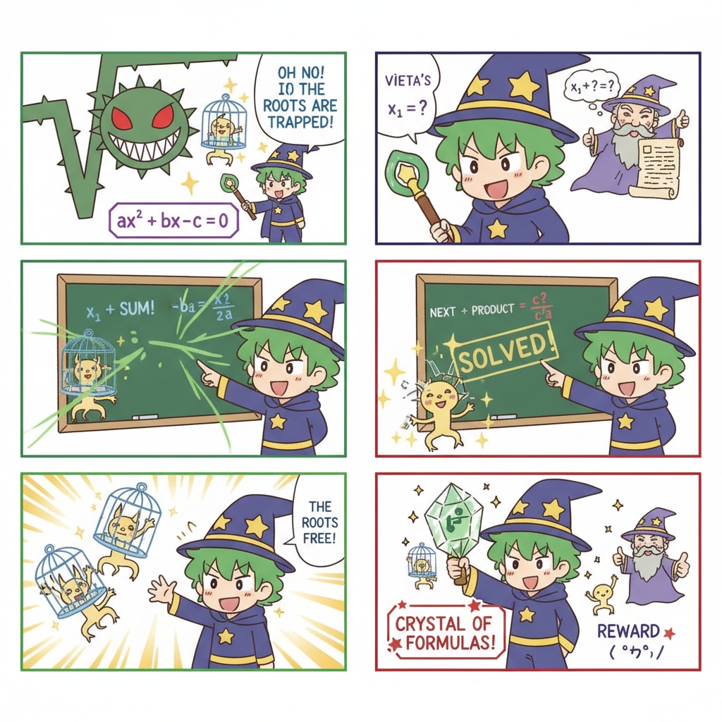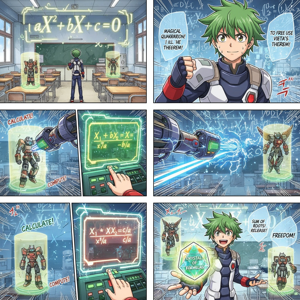 Комикс в жанре приключенческой школы магии. Герой — Макс Матемаг — сталкивается с магическим квадратным уравнением, которое держит в плену корни. Чтобы освободить корни, Максу нужно использовать Теорему Виета: сумма корней и произведение корней. Показать, как он вычисляет x_1+x_2=-b/a и x_1⋅x_2=c/a и шаг за шагом освобождает каждый корень. Финал — все корни свободны, а Макс получает “Кристалл Формул” как награду Цветовая гамма – зеленая, красно-синяя, желтая
