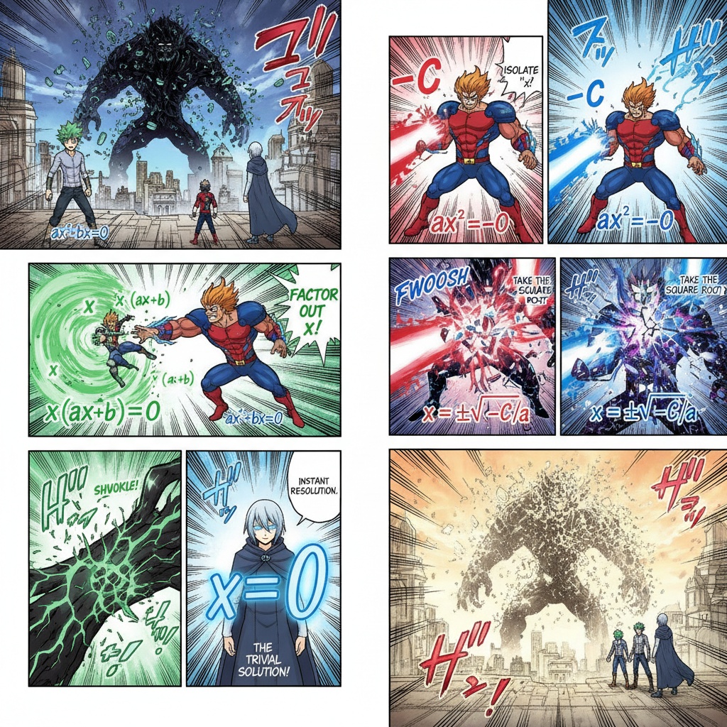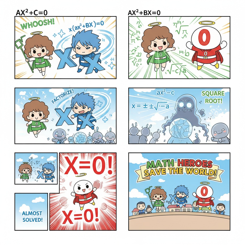 Комикс в жанре супергероики. Три супергероя — “ax^2+c=0”, “ax^2+bx=0” и “ax^2=0”. Каждый спасает мир своим методом решения. Герой без c умеет делить на x: на кадре x(ax+b)=0, герой без b умеет извлекать корень: на кадре ax^2=-c, третий герой решает мгновенно: на кадре x=0. Вставь динамичные кадры, где они показывают свои формулы как суперсилы. Цветовая гамма – зеленая, красно-синяя