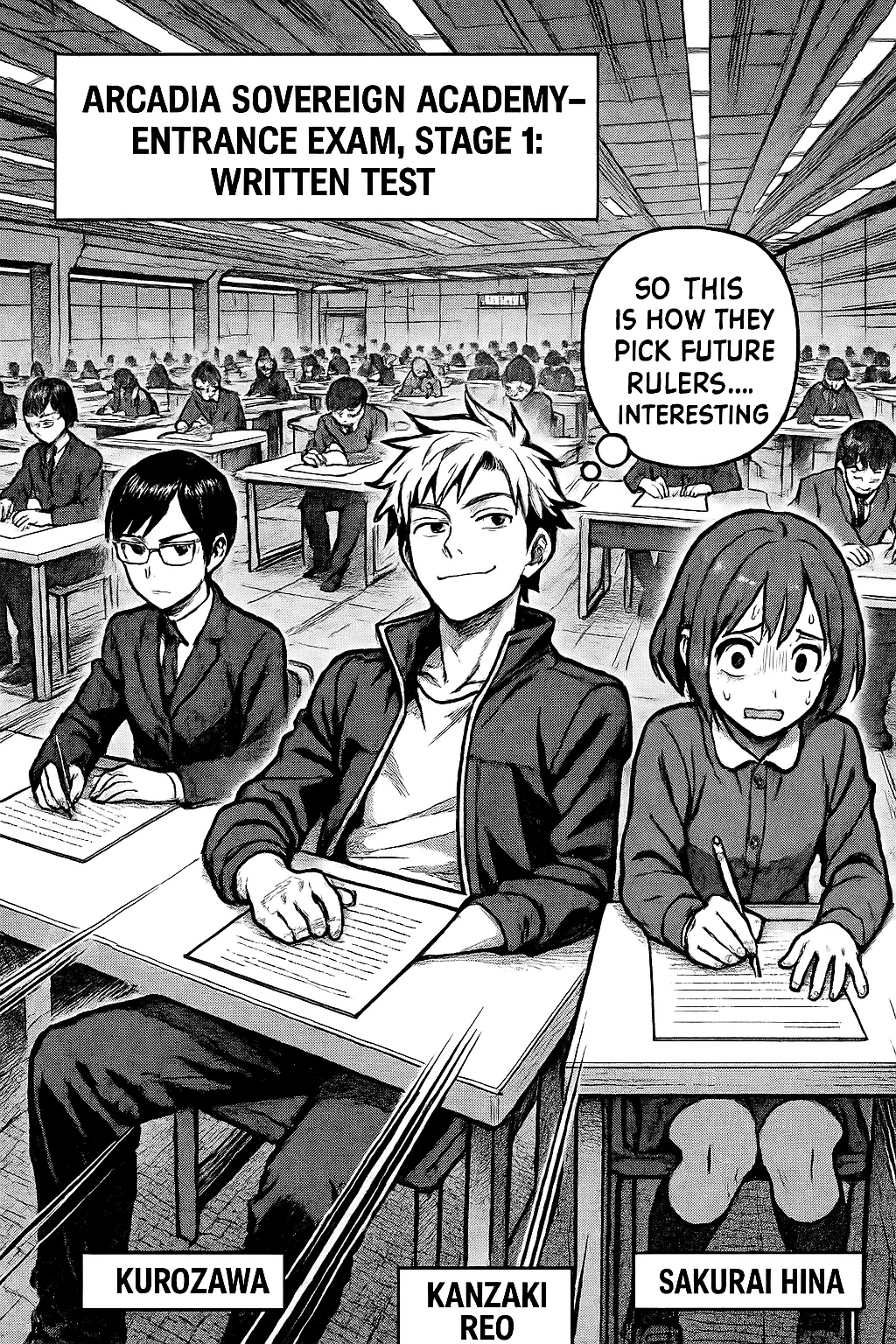 Panel 2: Interior of a massive, high-tech exam hall of Arcadia Sovereign Academy. Dozens of rows of desks with students sitting and taking a written exam. Overhead lights and digital clocks add a tense atmosphere. Focus on three students: