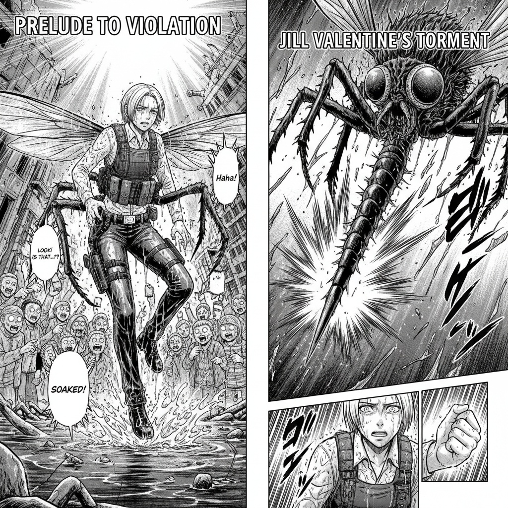 Jill Valentine's torment began in earnest the moment the giant zombie fly's stinger breached her defenses, but the prelude to that violation was a symphony of escalating dread and humiliation that chipped away at her unyielding resolve. As the creature hoisted her from the pool, water cascading from her toned, battle-hardened form, Jill Valentine—S.T.A.R.S. operative and survivor of countless horrors—felt the weight of a hundred eyes upon her. The civilians, those idle spectators frozen in morbid fascination, whispered and pointed, their phones capturing her soaked tactical vest and pants clinging transparently to her curves