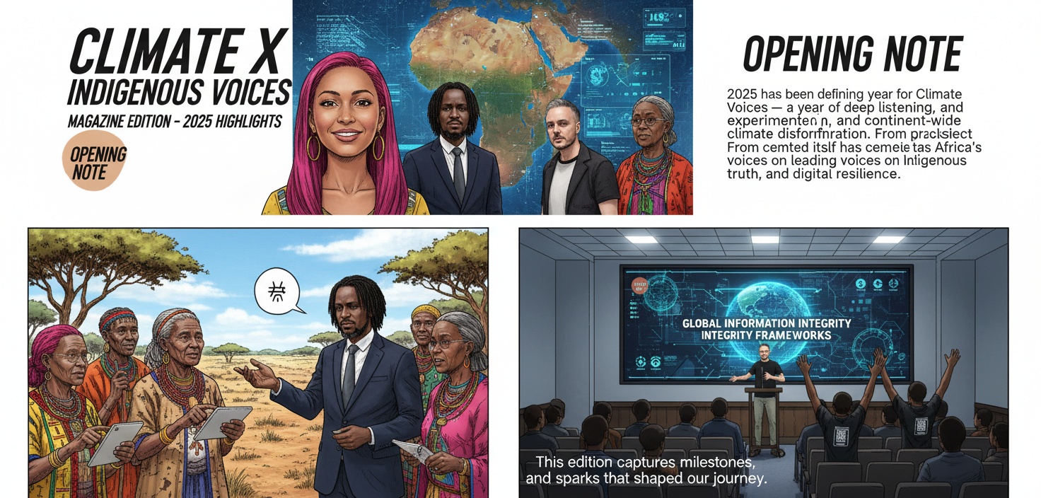 2025 has been a defining year for Climate X Indigenous Voices — a year of deep listening, bold experimentation, and continent-wide action against climate disinformation. From grassroots fieldwork to global information integrity frameworks, this project has cemented itself as one of Africa’s leading voices on climate truth, Indigenous knowledge, and digital resilience.