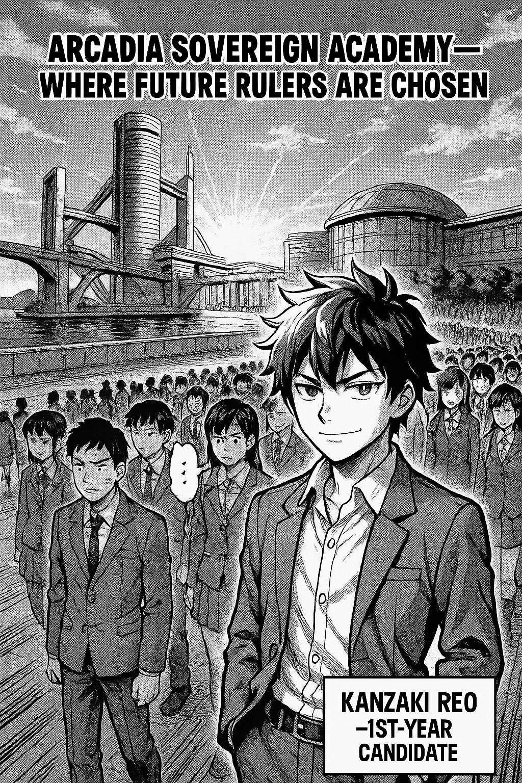 Panel 1: Wide cinematic shot of Arcadia Sovereign Academy, a gigantic ultra-modern school complex on an artificial island at sunrise. Sleek towers, bridges, and a huge exam building, with crowds of nervous teenagers in school uniforms lining up outside for the entrance exam. In the foreground, one boy stands out: Kanzaki Reo, a confident first-year candidate with messy dark-gold hair and sharp amber eyes, hands in his pockets, looking relaxed and slightly amused while everyone else looks tense. Big caption at the top: “Arcadia Sovereign Academy – where future rulers are chosen.” Manga style, clean shounen lineart, high contrast, dynamic composition.