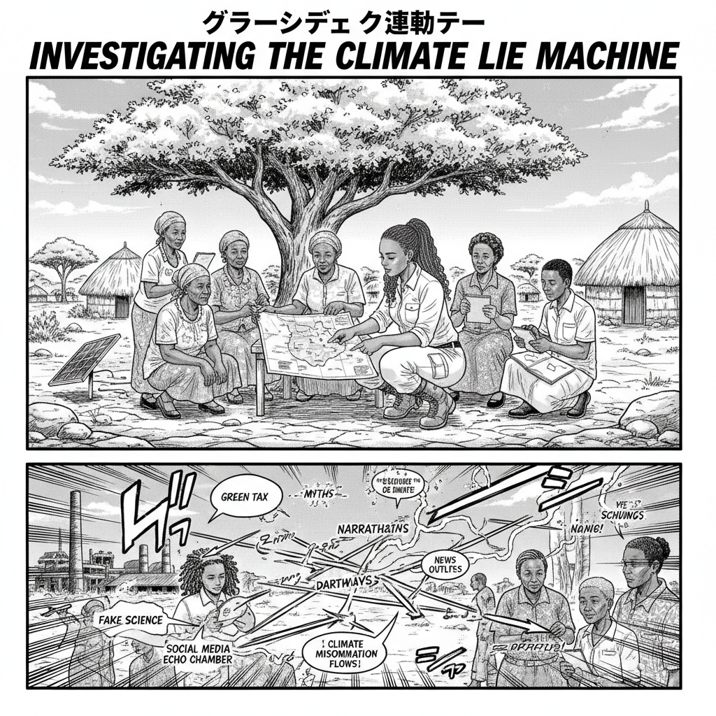 Panel 2: Abstract, stylized infographic panel showing climate misinformation flows, myths, and narrative pathways, drawn in a cyber-manga style.