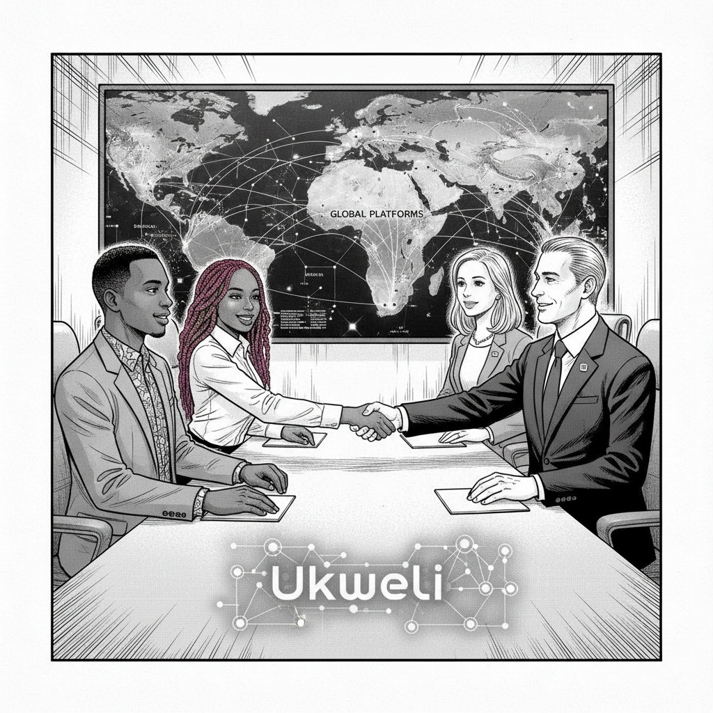 Panel 1: African creators shaking hands with UNESCO representatives, with a digital network linking Africa to global platforms.