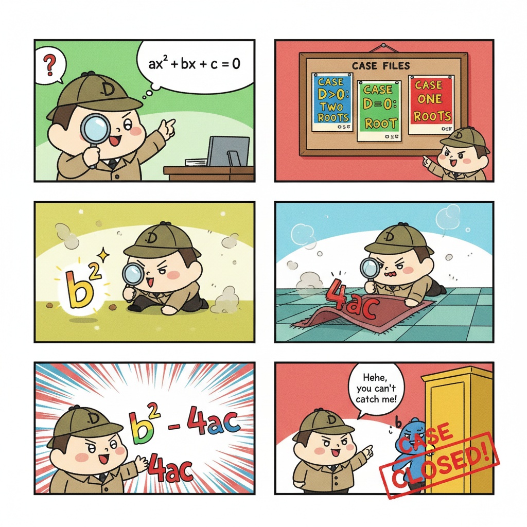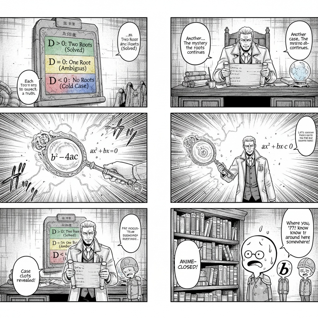 Комикс в жанре детектива. Главный герой — Следователь Дискриминант (символ D), который расследует дело о количестве корней уравнения. Каждое уравнение — подозреваемый. Вставь сцену: на стене висит таблица дел — “D>0 — два корня”, “D=0 — один корень”, “D<0 — корней нет”. Пусть Дискриминант ищет улики: b² - 4ac. Добавь юмор: переменная b прячется за шкафом/ Цветовая гамма – зеленая, красно-синяя, желтая