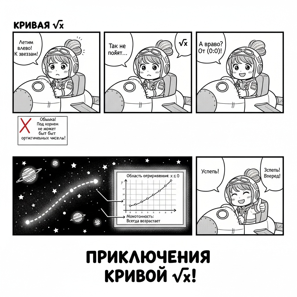 Создай комикс в стиле космического путешествия. Главная героиня — пилот Кривая √x. Её космокорабль строит траекторию строго вправо, начиная из точки (0;0). На экранах корабля отображаются точки графика. Добавь первые кадры: герой пробует лететь влево — “Ошибка! Под корнем не может быть отрицательных чисел!”. Добавь панель с подписанными свойствами: область определения, монотонность, медленный рост