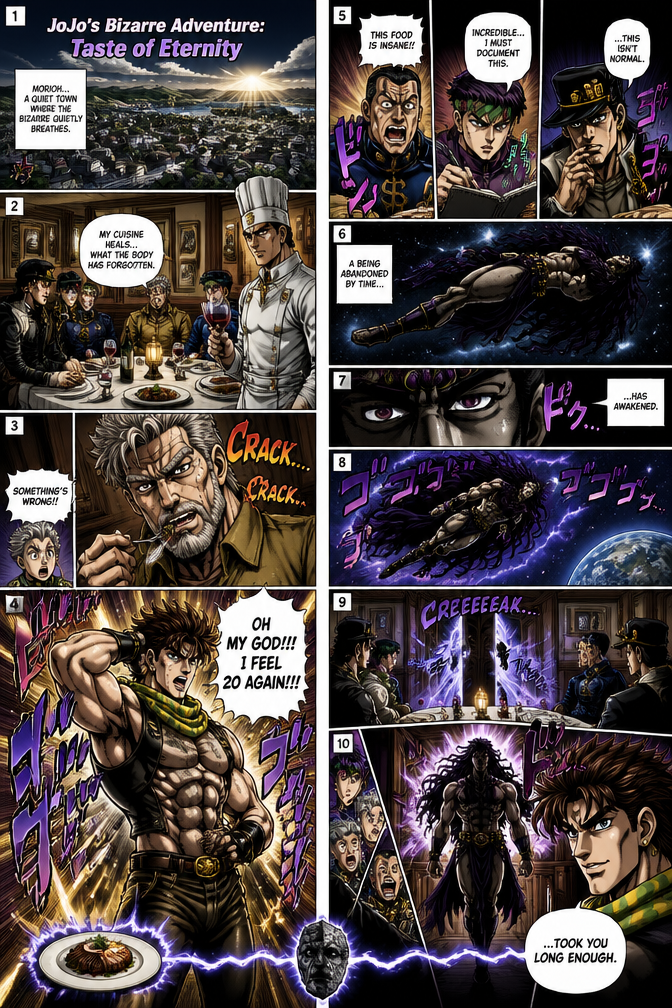 Highly detailed manga inspired by JoJo’s Bizarre Adventure (dynamic poses, dramatic lighting, strong shadows, exaggerated anatomy, fashion-forward designs, intense facial expressions, surreal energy effects, stylized sound effects)