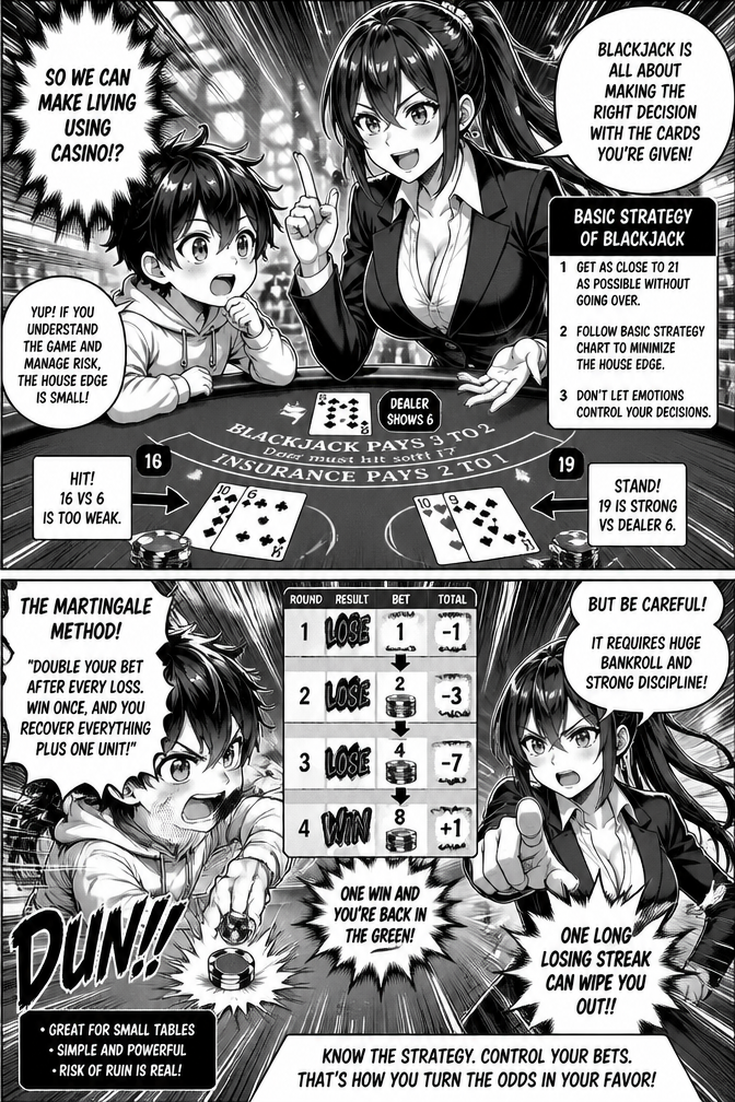 A one shota looking boy and a uni student girl (wearing a suit) talks about how to make living using Casino. They talk about Basic strategy of blackjack and martingale method.