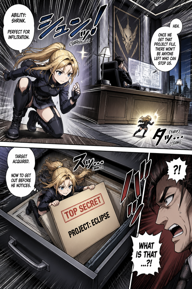 a blond girl who has the ability to shrink and who uses it to sneak into bad guys office and to steal their documents