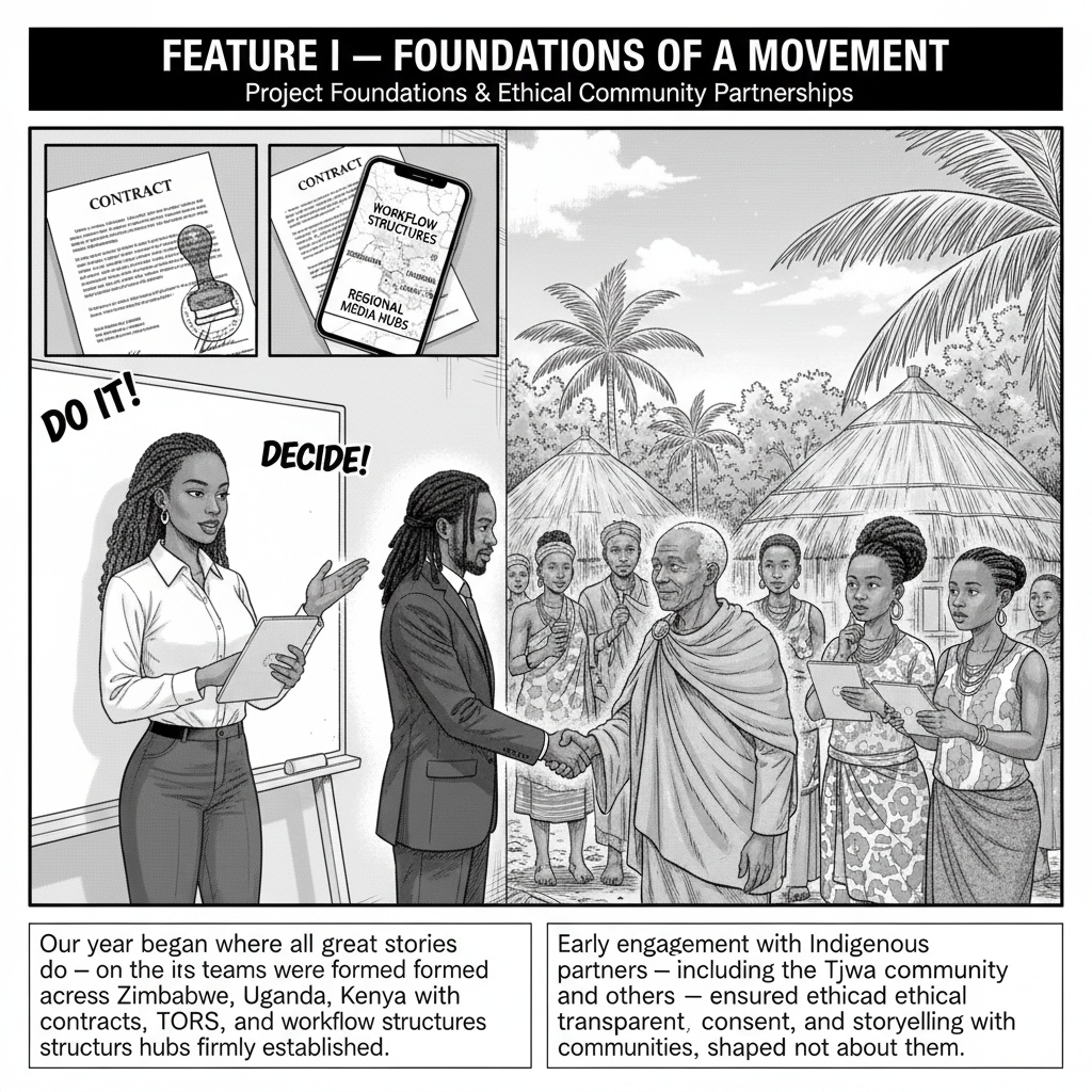Our year began where all great stories do — on the ground. Core teams were formed across Zimbabwe, Uganda, Kenya and regional media hubs, with contracts, TORs, and workflow structures firmly established.