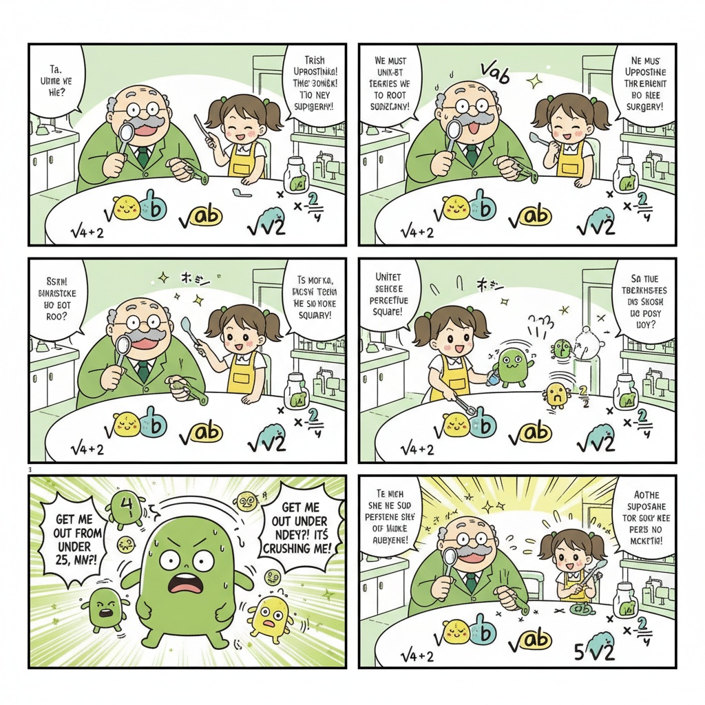 Комикс в стиле научной лаборатории. Два героя — Профессор Радикан и его помощница Упростинка — проводят “операцию” над выражениями √a, √b, объединяя их, вынося множители из-под корня, упрощая дроби. Покажи смешную сцену: на столе лежат выражения, как материалы для эксперимента, а герои аккуратно “перекладывают” множители. Используй зелёные и жёлтые тона. Добавь комическую сцену: выражение √50 кричит — “Вытащите меня из-под 25!”