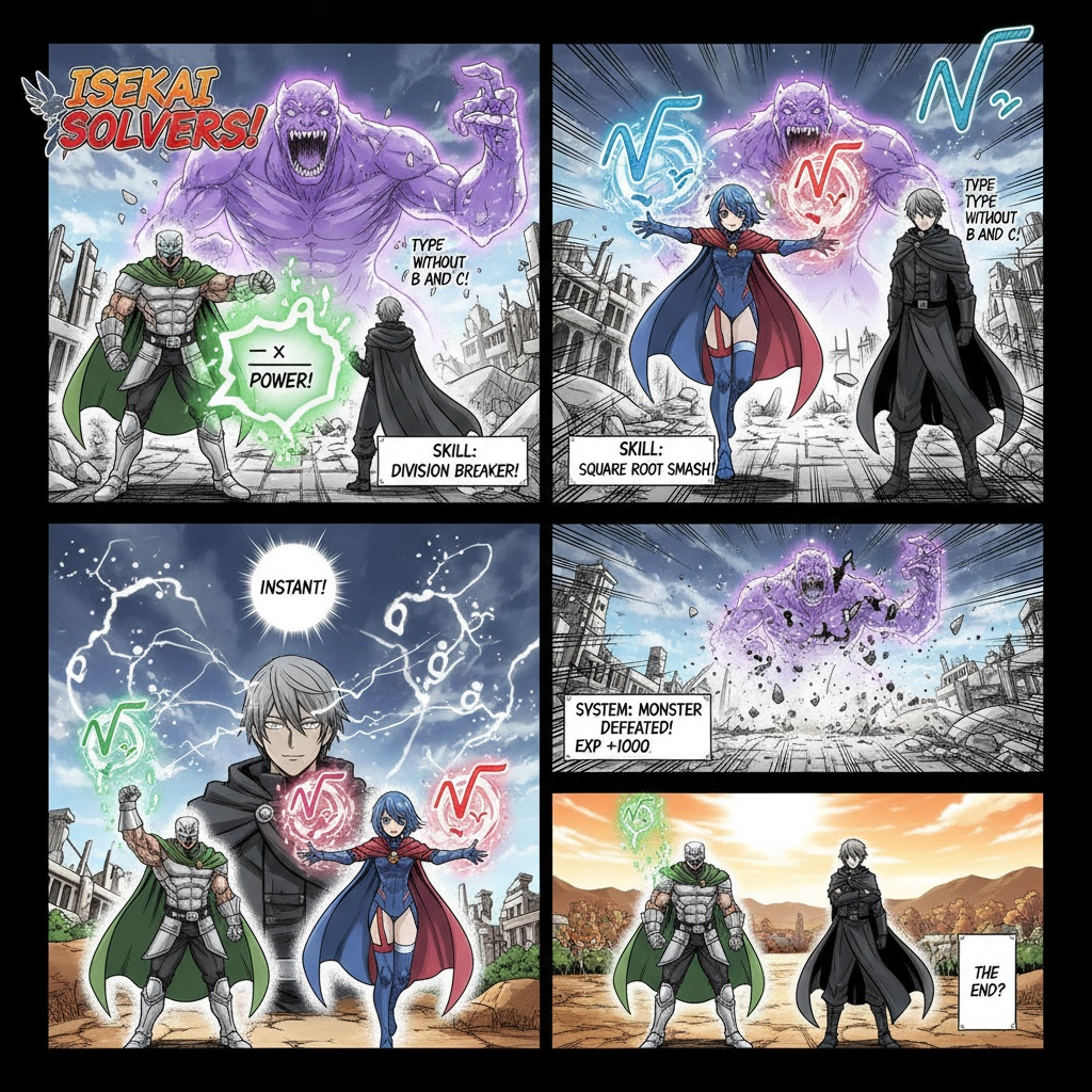 Комикс в жанре супергероики. Три супергероя — “Тип без b”, “Тип без c” и “Тип без b и c”. Каждый спасает мир своим методом решения. Герой без b умеет делить на x, герой без c умеет извлекать корень, третий герой решает мгновенно. Вставь динамичные кадры, где они показывают свои формулы как суперсилы. Цветовая гамма – зеленая, красно-синяя