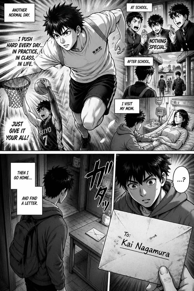 a normal boy whos very athletic has a normal day in high school. when he leaves the school he goes to the hospital to visit his mom. then he goes home and finds a letter. his name is Kai Nagamura.