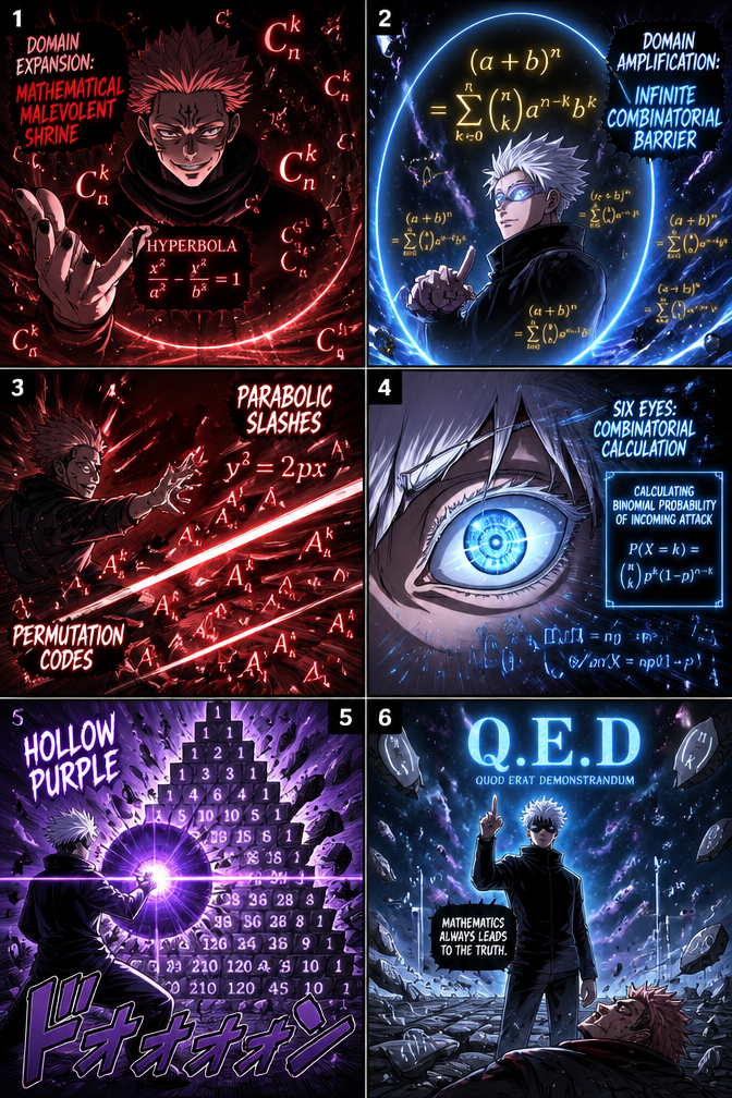 A professional 6-panel colored manga page. [Plan 1: Domain Expansion] Panel 1: Sukuna summons a dark domain filled with glowing red Hyperbola equations and floating Combination symbols $C_n^k$. Panel 2: Gojo counters with a blue Ellipse barrier protected by golden Binomial Newton expansion formulas $(a+b)^n$. [Plan 2: The Ultimate Clash] Panel 3: Sukuna fires Parabolic slashes $y^2=2px$ mixed with Permutation codes $A_n^k$. Panel 4: Close up on Gojo's Six Eyes calculating the binomial probability of the attack. Panel 5: Gojo fires a massive "Hollow Purple" orb, merging energy that shatters a giant Pascal's Triangle in the background. Panel 6: Gojo stands victorious over the shattered coordinate grid, floating "Q.E.D" text in the sky. Style: High-quality colored anime art, vibrant neon blue and red effects, cinematic lighting, sharp mathematical debris.