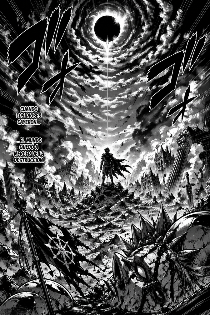1 Panel (Splash Page). El campo de batalla destruido. Es la introducción, debe ser una imagen impactante.